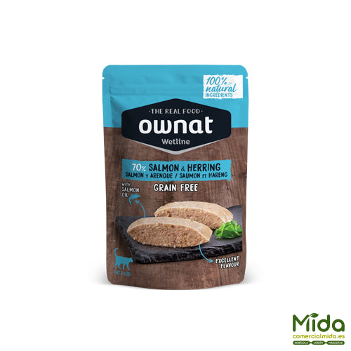 OWNAT Wetline Salmon & Herring, receta destaca por su alto contenido de pescado: salmón (45%) y arenque (25%), sumando un 70% de ingredientes principales de origen marino, lo que incrementa la aceptación incluso en gatos exigentes