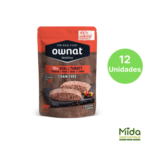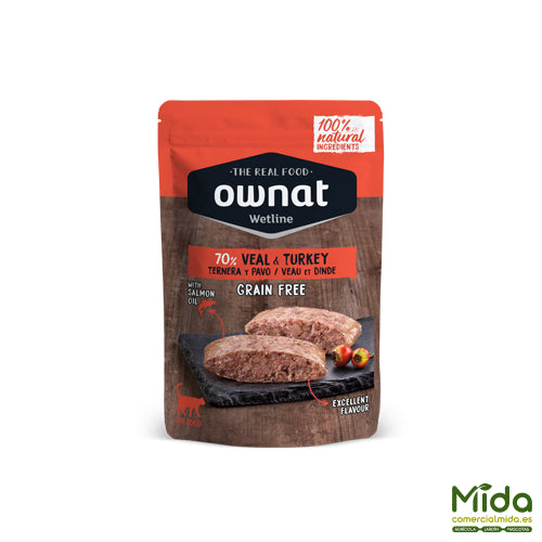 OWNAT Wetline Veal & Turkey es un alimento húmedo 100% natural para gatos de todas las edades y tamaños, elaborado únicamente con carnes de verdad (sin carnes reconstituidas, sin harinas y sin huesos) para una calidad y apetencia superiores. Su receta es sin cereales, lo que favorece una digestión ligera y lo convierte en una opción adecuada para gatos con alergias o intolerancias a cereales o gluten. Combina ternera y pavo como fuentes principales de proteína animal, aportando un sabor intenso y una textura muy palatable. Es ideal para utilizar como alimento completo o para combinar con pienso seco.