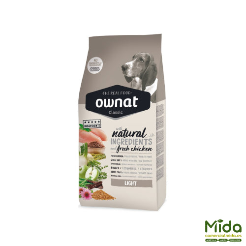 El pienso Classic Light de Ownat es un tipo de alimento seco indicado para completar la dieta de los perros de cualquier raza o edad que sufran problemas de sobrepeso. Este pienso de calidad premium incorpora carne fresca e ingredientes 100% naturales en sus recetas. Su composición está libre de colorantes, aditivos artificiales y colorantes y únicamente incorpora componentes con un bajo nivel de materias grasas para reducir las calorías y poder mantener un peso óptimo. El nivel de proteínas es alto para asegurar el correcto mantenimiento de la masa muscular. La receta incluye arroz integral fácil de digerir, fruta fresca que actúa como potente antioxidante natural, plantas aromáticas que mejoran el bienestar digestivo y levadura de cerveza para la completa protección del sistema inmunitario. Este alimento presenta un completo equilibrio nutricional entre los componentes para garantizar la plena condición física de los perros. Completa la dieta habitual de las mascotas y garantiza el control de la subida de peso.