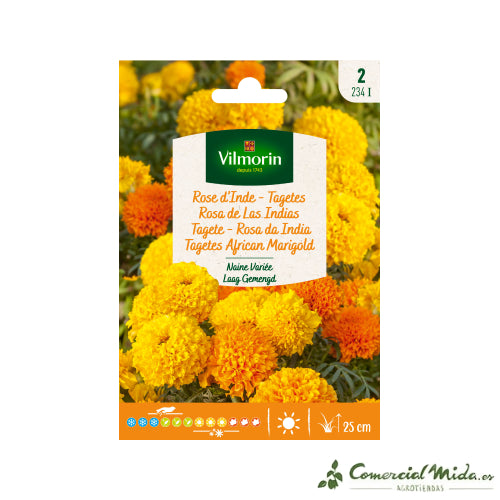La Rosa de las Indias Enana Variada de Vilmorin es una planta anual compacta y robusta, ideal para bordes y macizos. Sus flores redondas tipo crisantemo, en tonos que van del amarillo limón al naranja intenso, aportan color y vitalidad al jardín durante toda la temporada. Además de su valor ornamental, esta variedad es conocida por repeler nematodos del suelo, ayudando a proteger la salud del entorno de cultivo.