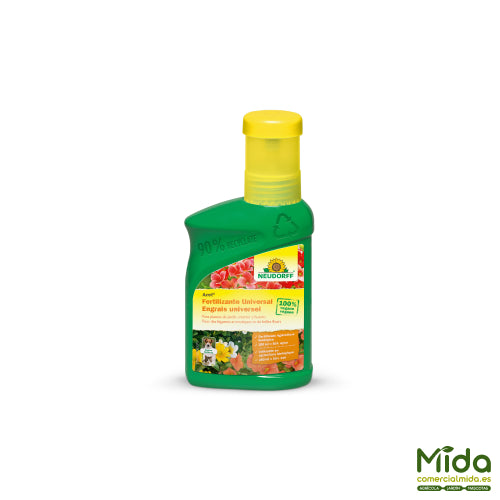 NEUDORFF AZET Fertilizante Universal es un abono orgánico líquido de origen vegetal formulado para potenciar el crecimiento, la productividad y la floración de las plantas de jardín. Su combinación especial de nutrientes, con énfasis en el potasio, ayuda a mantener plantas más vigorosas y con mejor rendimiento, tanto en interior como en exterior. Presenta una fórmula equilibrada NPK 3-3-3, adecuada para un abonado regular durante el periodo de crecimiento. Está certificado para Agricultura Ecológica y es seguro para mascotas, ideal para hogares con animales. Se ofrece en formatos 250 ml (rinde hasta 50 L) y 1 L (rinde hasta 200 L) de solución fertilizante. No es apto para cultivo hidropónico.