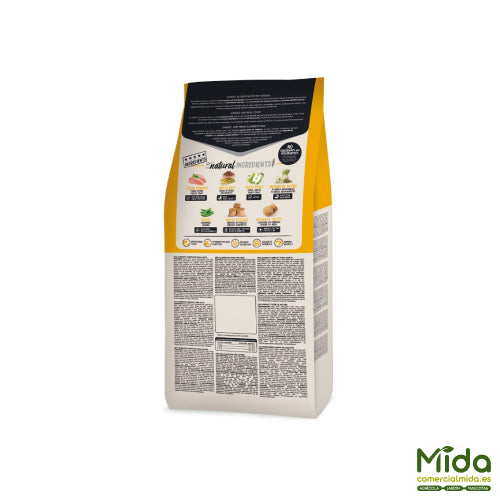 Carnes 36% (carnes deshidratadas 26%, pollo fresco* 10%), maíz integral* (20%), grasa de pollo, trigo integral* (9%), cebada integral* (7%), guisantes enteros* (5%), arroz integral* (5%), proteínas de maíz, levadura de cerveza* (1,5%), proteína hidrolizada de pollo, pescado deshidratado, manzana fresca* (1%), aceite de salmón, pulpa de remolacha, extracto de malta, fructo y manano oligosacáridos, hierbas botánicas 0,02% (hinojo*, flor de manzanilla*, anís verde*), yucca schidigera. *Ingredientes naturales.