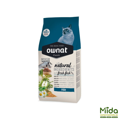 El pienso Classic Cat Fish de Ownat es un tipo de alimento seco indicado para completar la dieta de los gatos de cualquier raza o edad. Este pienso de calidad premium incorpora carne fresca e ingredientes 100% naturales en sus recetas. Su composición está libre de colorantes, aditivos artificiales y colorantes y únicamente incorpora arroz integral, fruta fresca, plantas aromáticas, legumbres, semillas de lino y levadura de cerveza en mistura con los nutrientes esenciales que mantienen a las mascotas activas y fuertes. El aporte adicional de ácidos grasos Omega 3 y 6 ayuda a mantener una piel y pelo suaves, sedosos, elásticos y fuertes. Presenta un completo equilibrio nutricional entre los componentes para garantizar la plena condición física de los felinos. Este alimento completa la dieta habitual de las mascotas y las raciones podrán variar en función de la raza, el sistema digestivo y las necesidades específicas de cada animal.