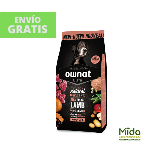El pienso Ultra Medium Lamb&Rice de Ownat es un tipo de alimento seco indicado para completar la dieta de los perros sensibles a los problemas digestivos y de piel. Este pienso de calidad premium incorpora en su receta carne fresca e ingredientes 100% naturales seleccionados por su baja capacidad de producir alergias, para evitar reacciones alérgicas y malestar estomacal en los animales. Los ingredientes de la receta han sido minuciosamente seleccionados y cocidos muy lentamente a baja temperatura para conseguir la máxima calidad nutricional. Presenta un completo equilibrio nutricional entre los carbohidratos y las proteínas, para garantizar la plena condición física de los perros. La carne de cordero ha sido elegida como fuente alternativa de proteína de gran apetencia. El arroz es la principal fuente de hidratos de carbono para garantizar alta tolerancia digestiva.