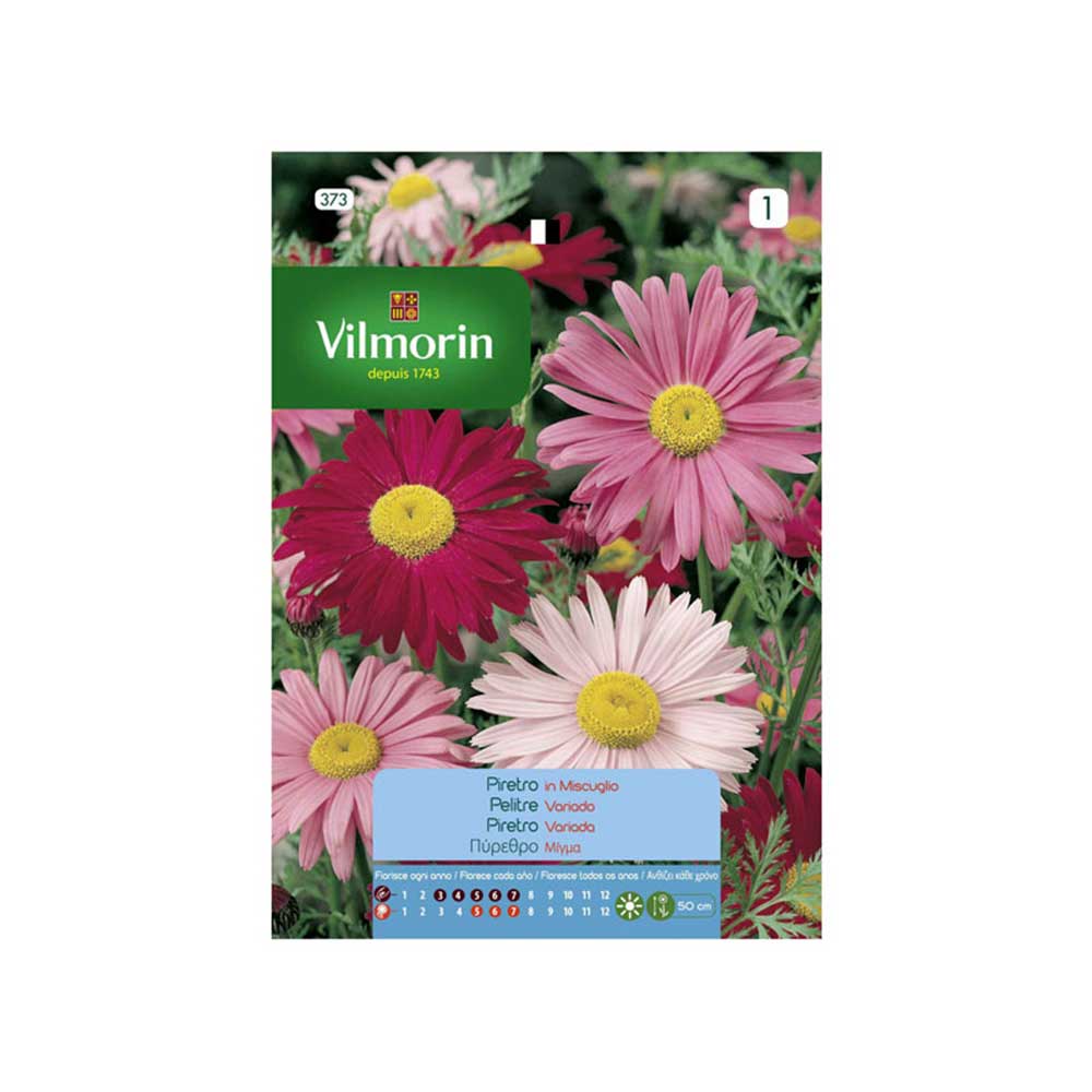 Las semillas de Vilmorin de pelitre gigante son simientes de fácil cultivo. Esta planta perenne es de tallo rastrero al comienzo y erguido al final, con ramificaciones. Las hojas tienen vello y las flores son grandes, vistosas y con colores vivos e intensos. La raíz es de sabor picante. Es muy usada como flor cortada, gracias a su buena conservación un jarrones y otros recipientes similares. El aceite de pelitre se usa como remedio tópico para el dolor de muelas e incrementa la salivación.